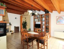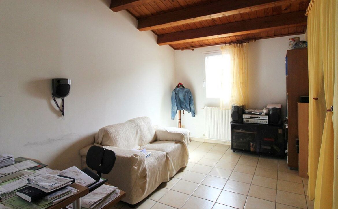 Going up to the first floor, the 145 m2 house offers a living room with fireplace, a kitchen, a bright double bedroom, a small bedroom with walk-in closet, a large bathroom with tub and shower, and a double laundry room. In addition, the stone terrace is perfect for relaxing outdoors.